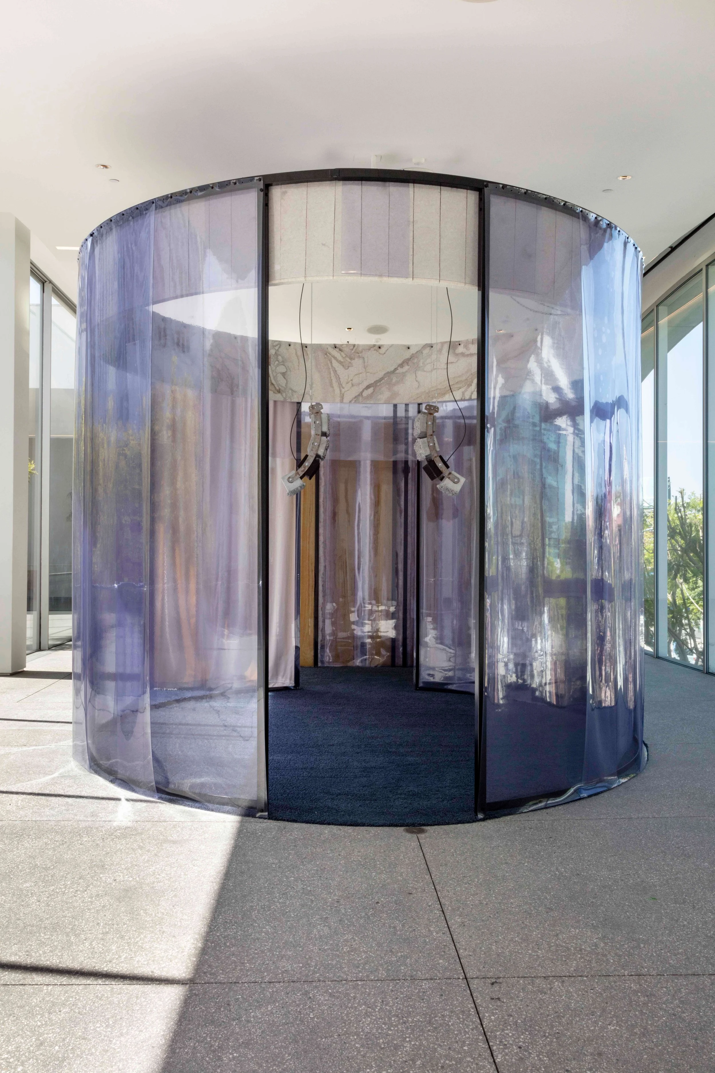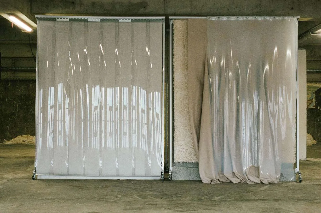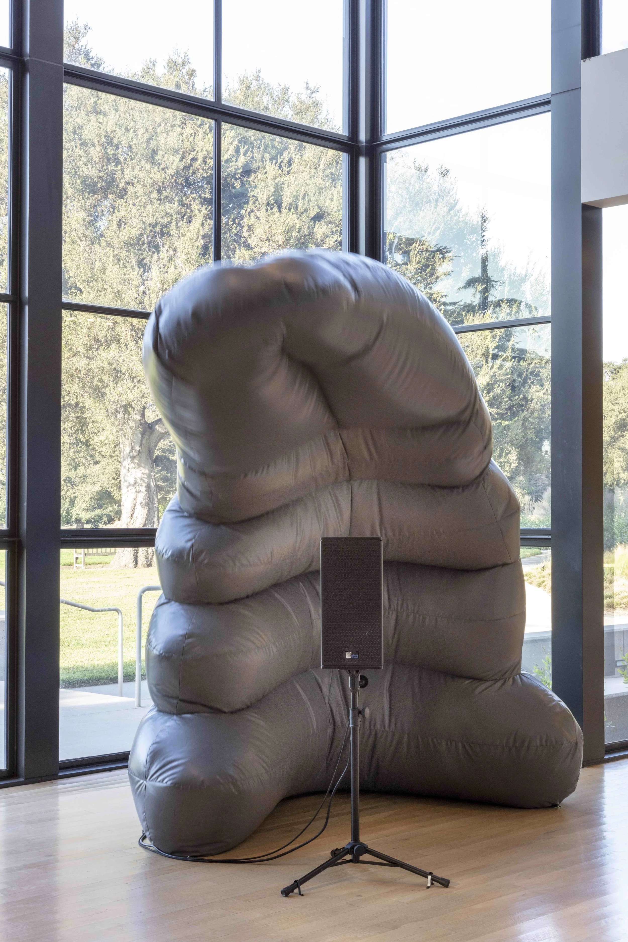 At the Carpenter Center, Jacqueline Kiyomi Gork fills Le Corbusier’s concrete spaces with sonic environments that blur architecture, clothing, and performance. Her “sound blanket” sculptures warp acoustics as much as they reference oversized coats; her clusters of wool and fiberglass columns mimic—and soften—the building’s Brutalist bones. In the central gallery, a platform of black river stones crunches underfoot, feeding amplified sound back into the room. Outdoors, an inflatable installation merges the hum of blowers with a new musical composition. Poems of Electronic Air reminds us that listening is physical, and architecture is never silent.